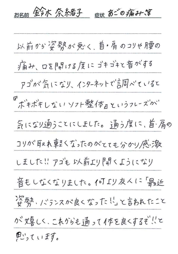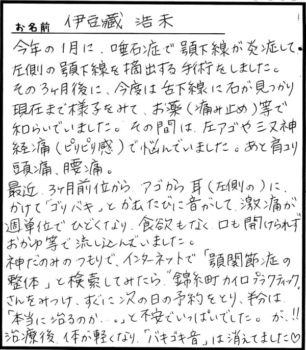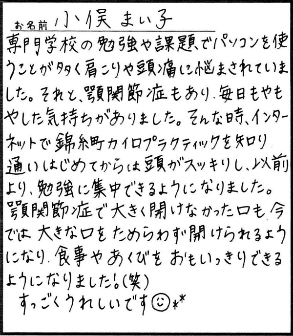 「アゴも以前より開くようになり音もしなくなりました。何より友人に「最近、姿勢、バランスが良くなった!!」と言われたことが嬉しい。」