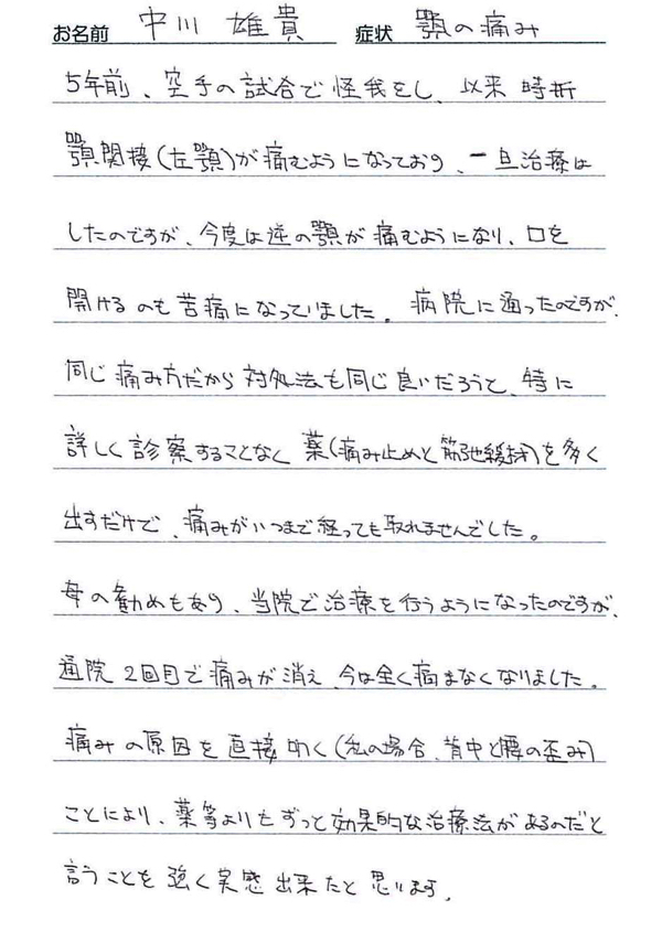 「あごの痛み、うでの痛み等が明らかに改善されているのが実感できます。感謝、感謝です」