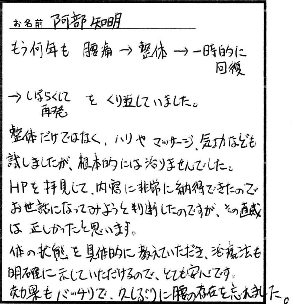 「だんだんと体の奥から暖かくなってゆき、痛みの芯をほぐしてもらってるような感じです。いまでは腰も伸ばせるようになりました。」