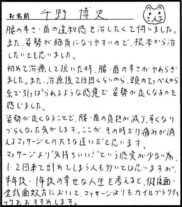 「姿勢が良くなることで腰・首の負担が減り、辛くなりづらくなった気がします。ここが、その時だけ痛みが消えるマッサージとの大きな違いだと思います。」