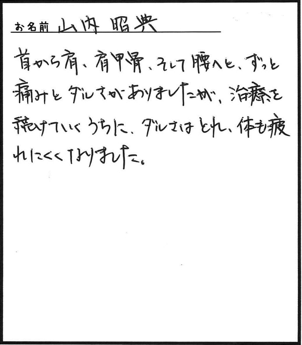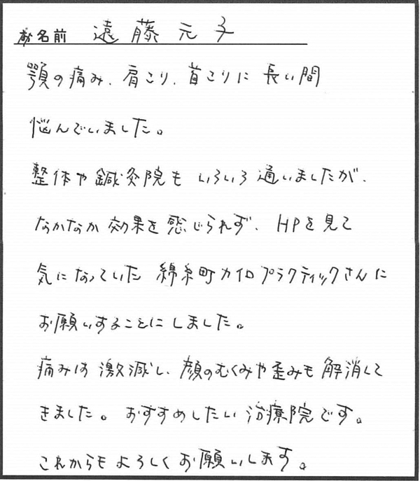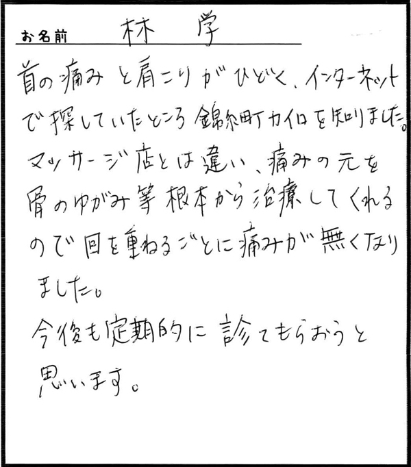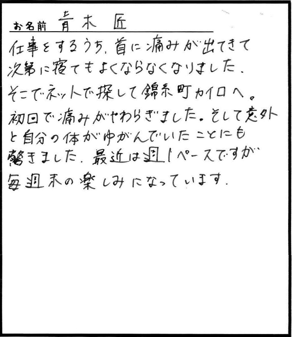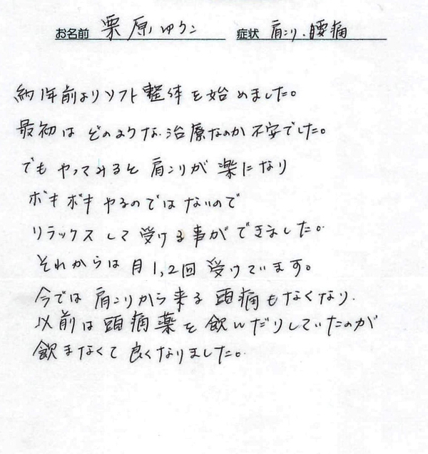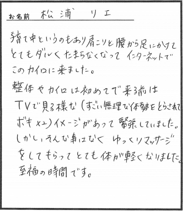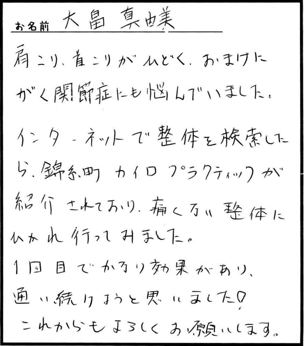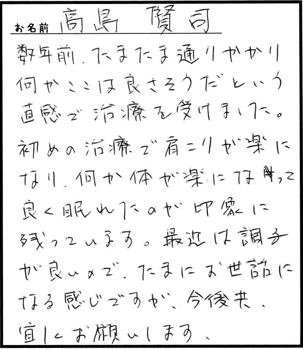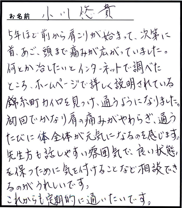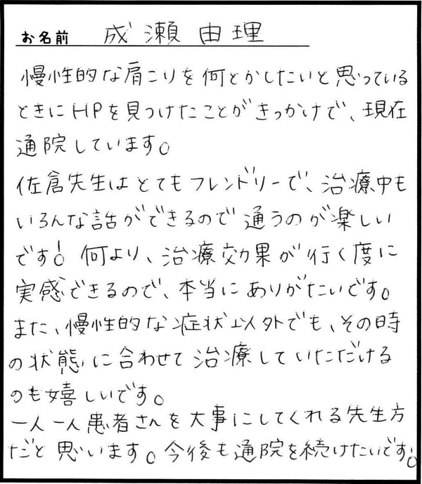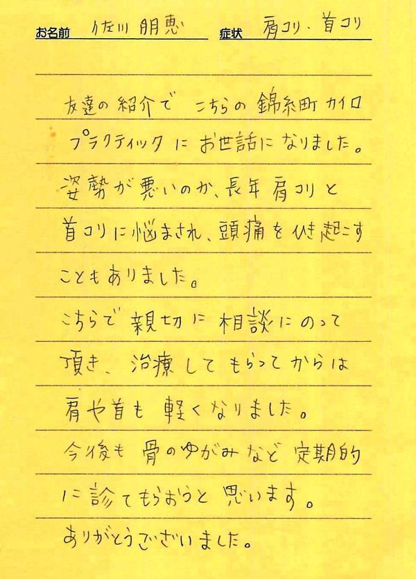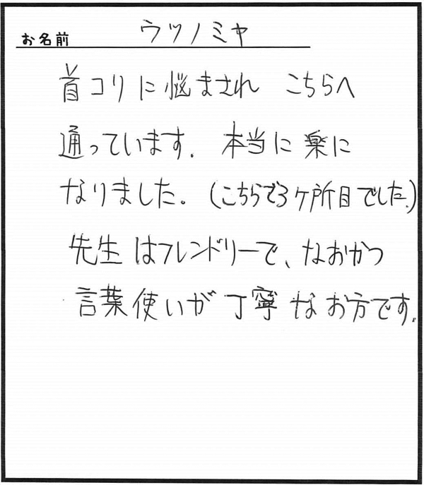 「こちらで親切に相談にのって頂き、治療してもらってからは肩や首も軽くなりました。今後も骨のゆがみなど定期的に診てもらおうと思います。」