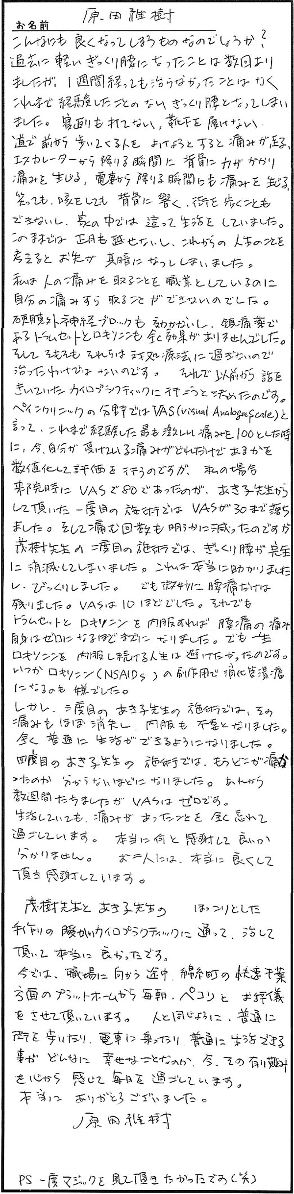 麻酔科医 原田先生の声「生活していても痛みがあったことを忘れてすごしています。お二人に本当に良くしていただき感謝しています。」