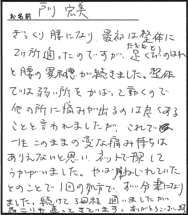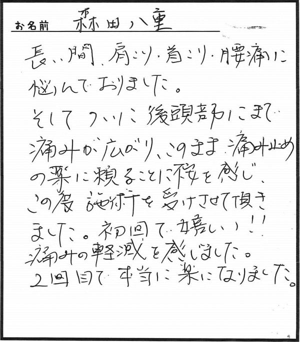 「腰がねじれていたとのことで1回の処方でずいぶん楽になりました。続けて3回ほど通いましたが肩こりも治ってきています。」