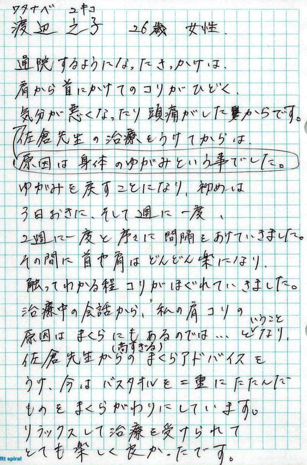 「初めの治療で肩こりが楽になり、何か体が楽になって良く眠れたのが印象に残っています。」