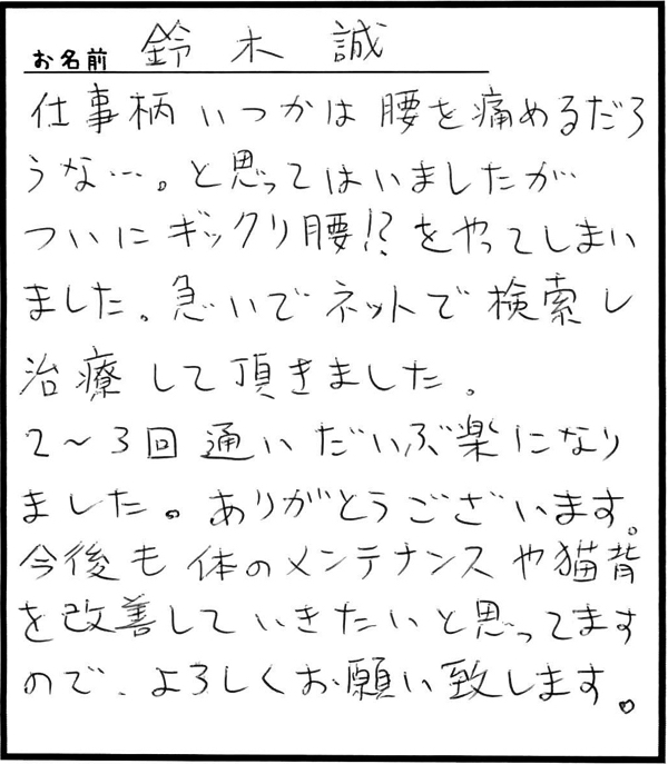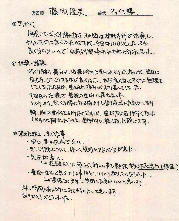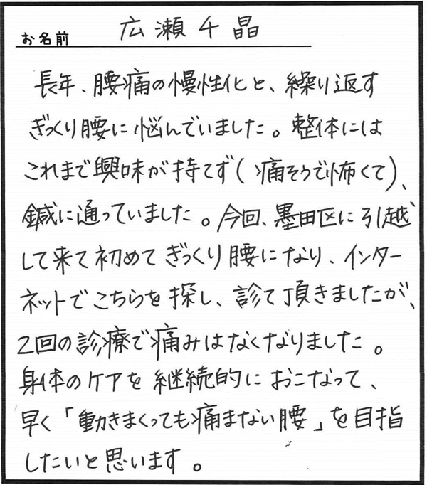「2回の診療で痛みはなくなりました。身体のケアを継続的におこなって早く「動きまくって痛まない腰」を目指したいと思います。」