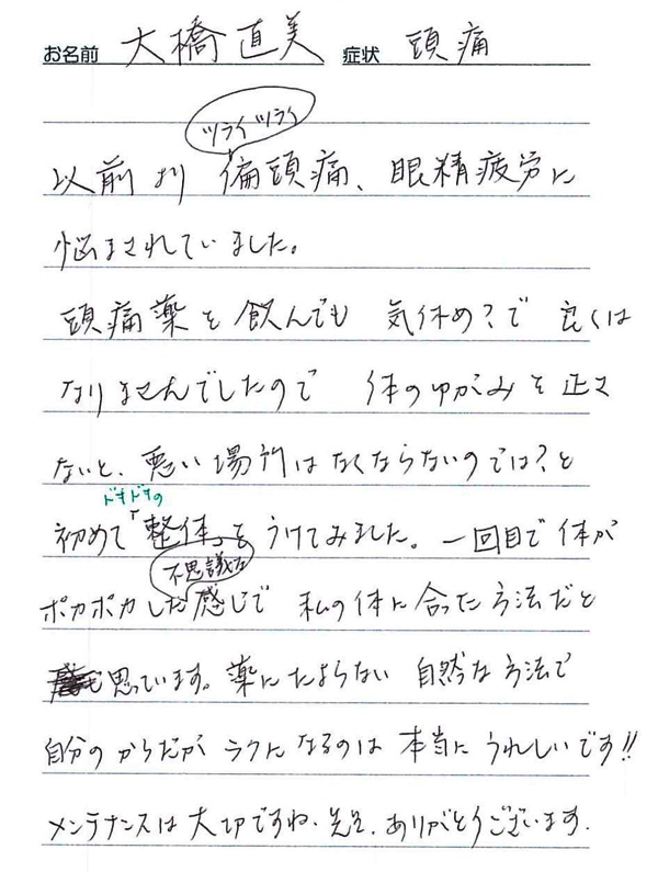 「以前は頭痛薬をのんだりしていたのが飲まなくても良くなりました。」
