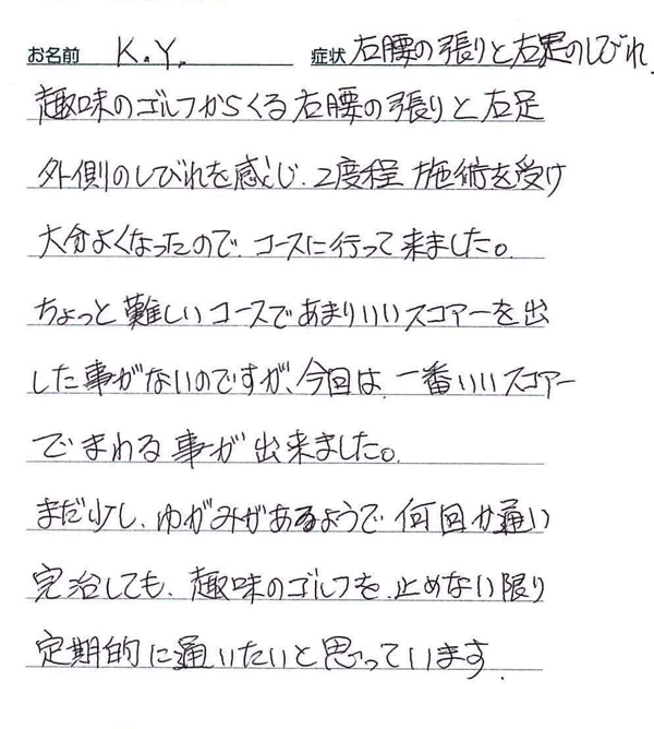 「趣味のゴルフからくる右腰の張りと右足の外側のしびれを感じ、2度ほど施術をうけ大分よくなったのでコースに行ってきました。」