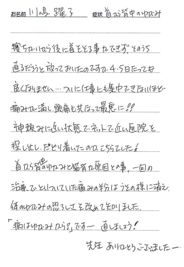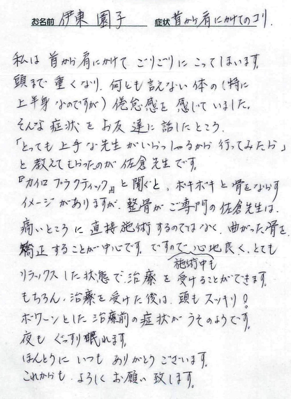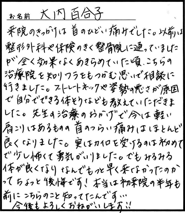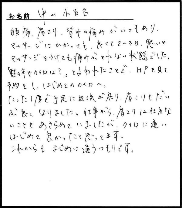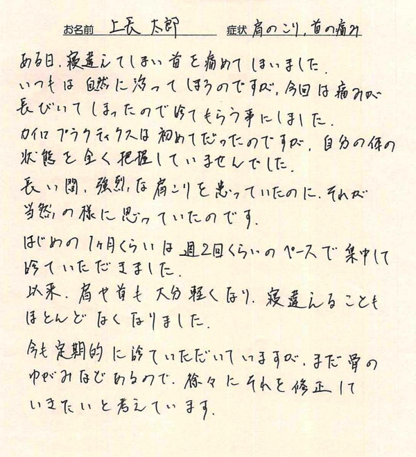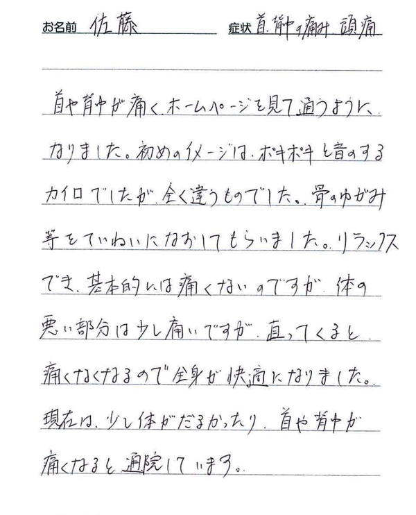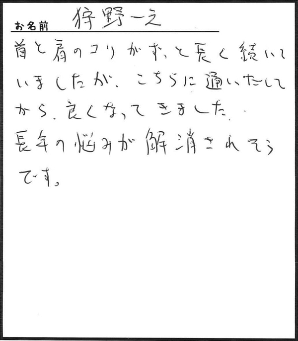 「首と肩こりがずっと長く続いてましたが、こちらに通いだしてから良くなってきました。」