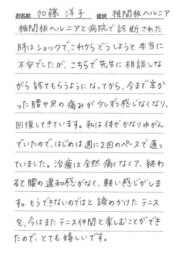「治療は全然痛くなくて終わると腰の違和感がなく軽い感じがします。もうできないのではと諦めかけたテニスを楽しむことができたので嬉しいです。」