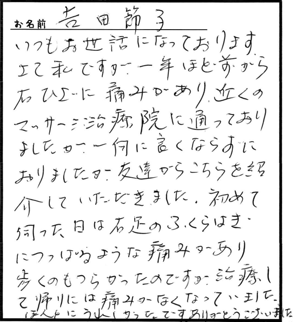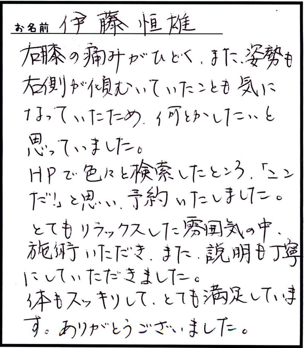 「歩くのもツラかったのですが治療して帰りには痛みがなくなっていました。」