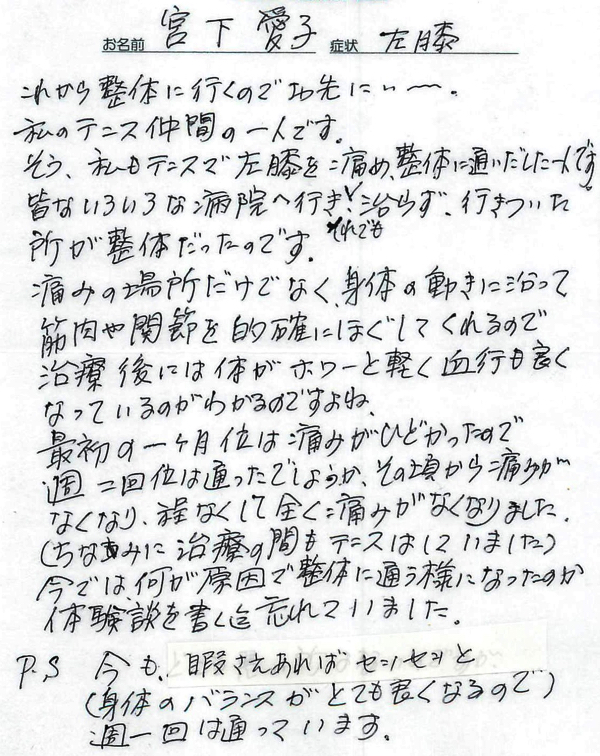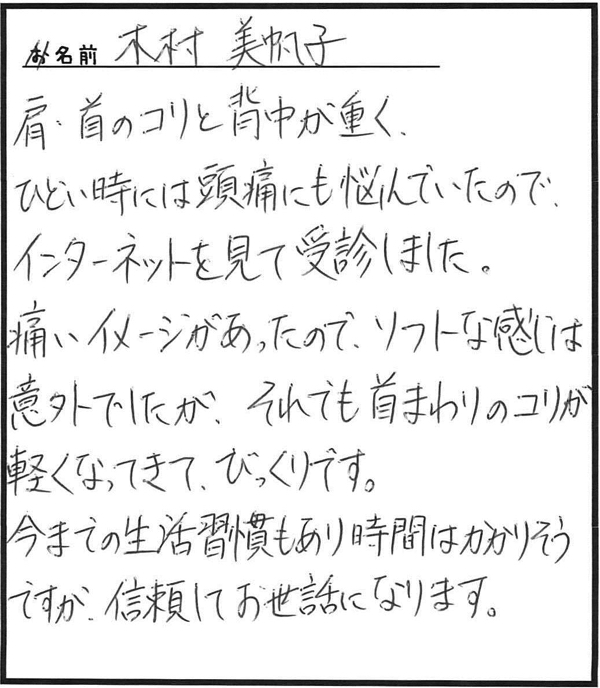 「とてもソフトな整体で、痛い治療に慣れている私は、はじめは物足りない感じがしたのですが、治療が終わると痛みが軽減されてすっきり」