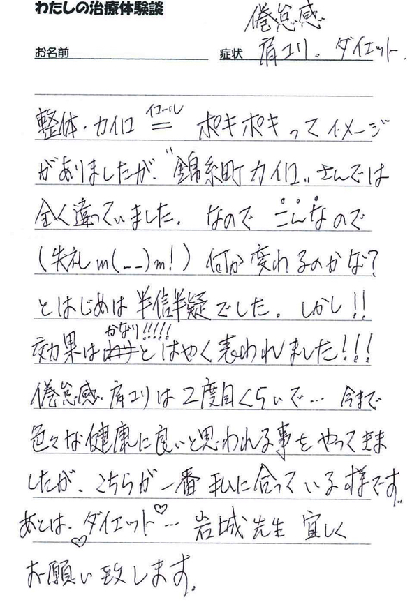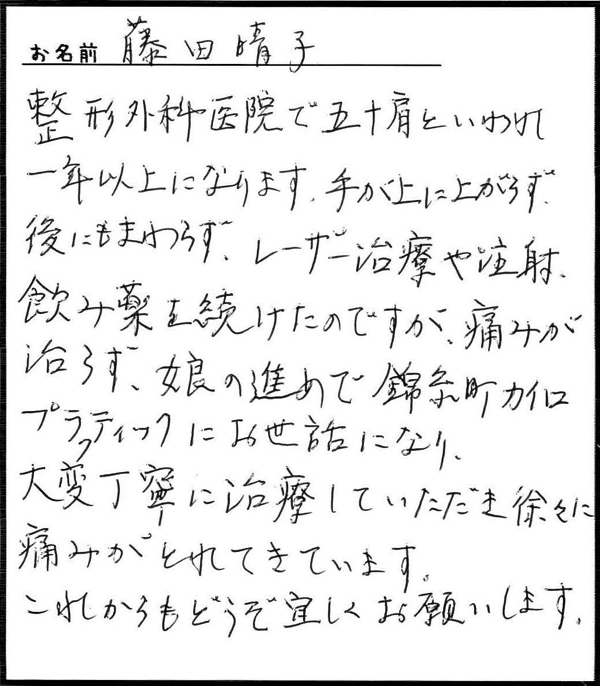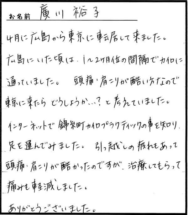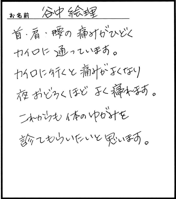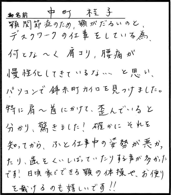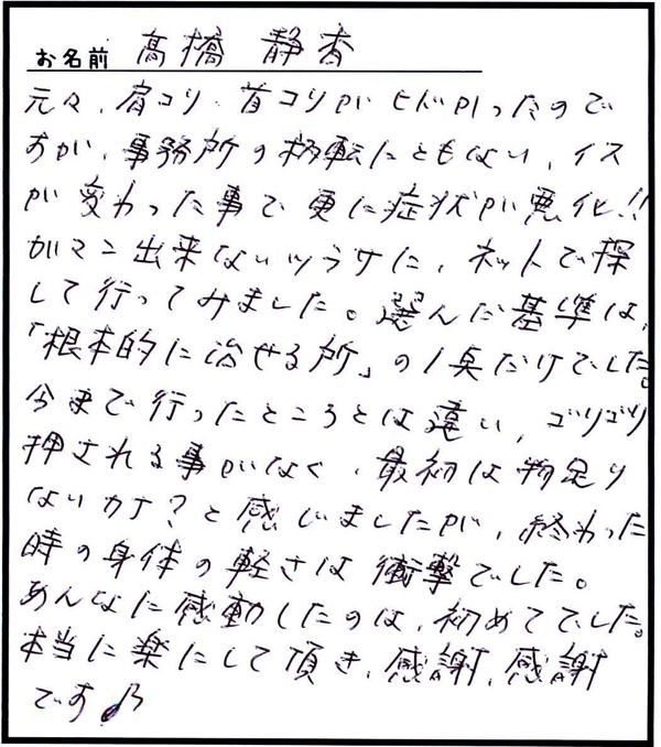 「仕事がら肩こりは仕方ないとあきらめていましたが、カイロに通い始めて良かったと思っています。」