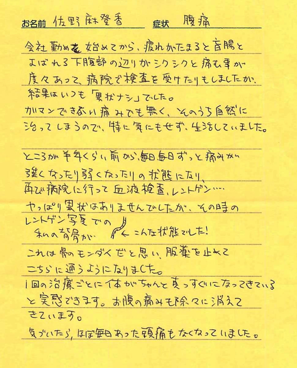 「初めて整体に通ってみて腰や背中の状態がよくなったので定期的に通っています。」