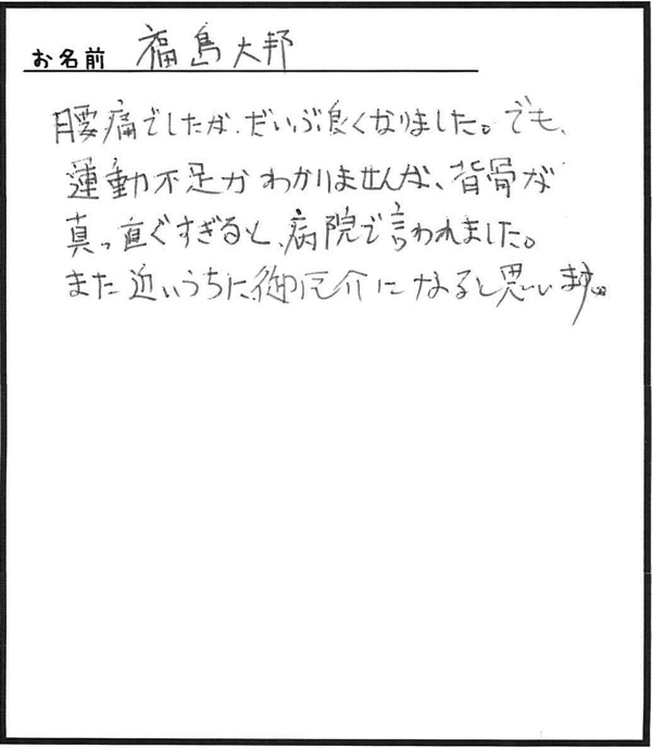 「先生のおかげで未だに手術に至る腰痛はでていません。」