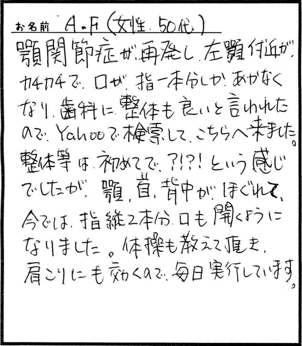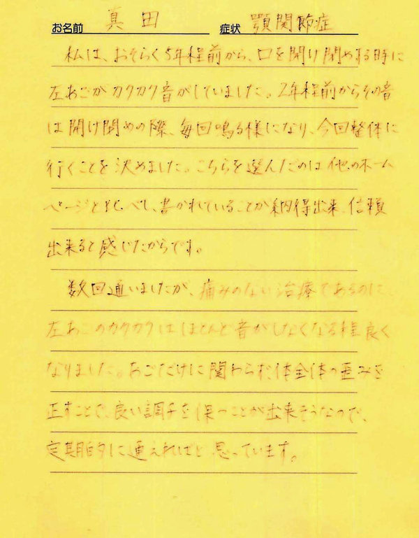 「左のあごのカクカクはほとんど音がしなくなる程良くなりました。」