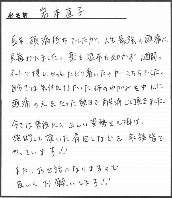 「自分では気づかなかった体のゆがみを中心に頭痛の基をたった数日で解消して頂きました。」