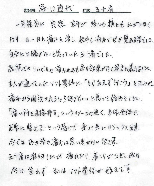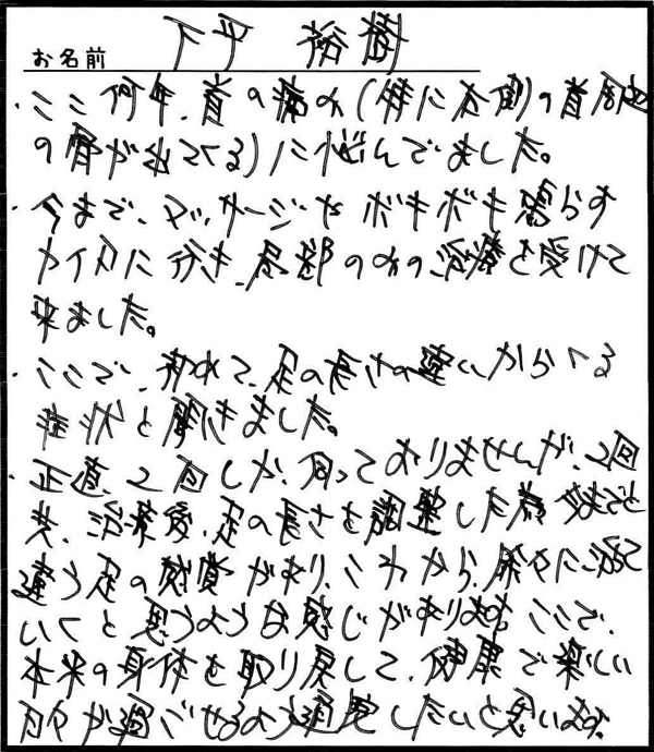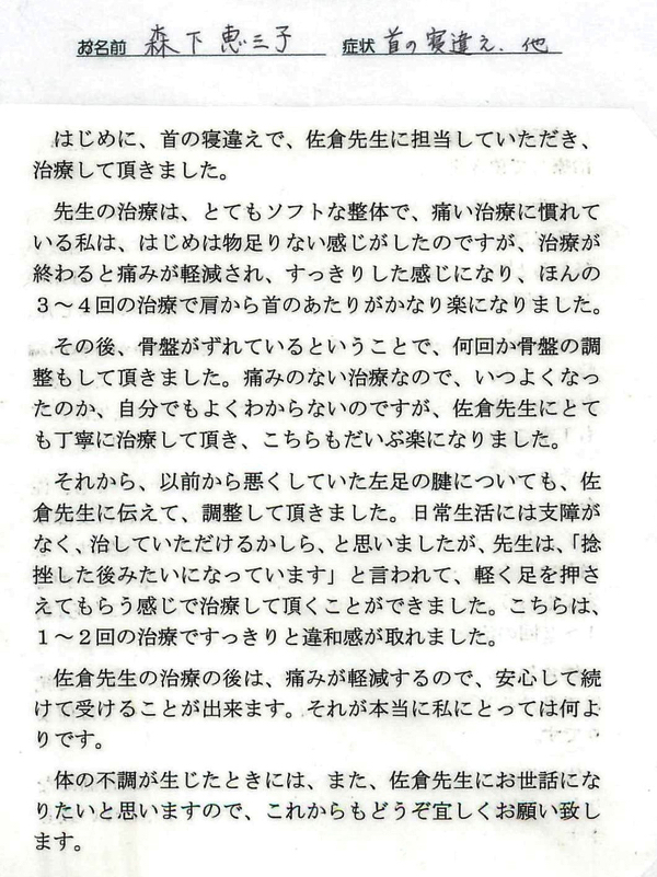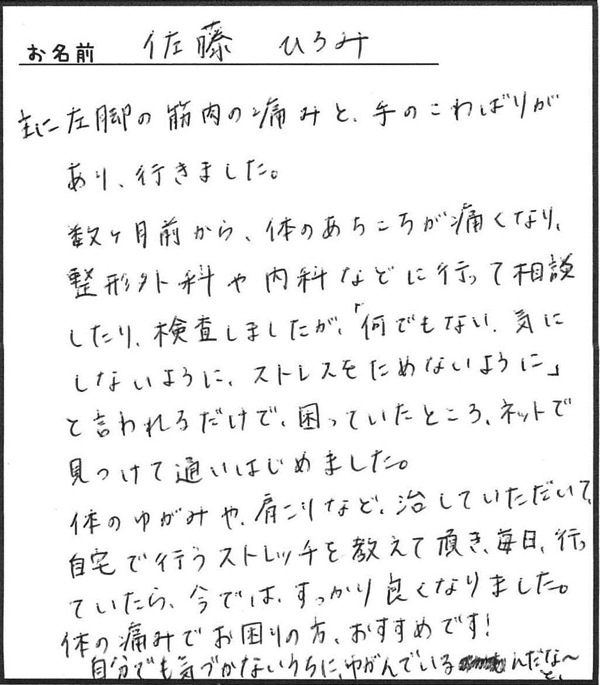 「体のゆがみや肩こりを治していただいて自宅で行うストレッチを教えて頂き、毎日行っていたら今ではすっかり良くなりました。」